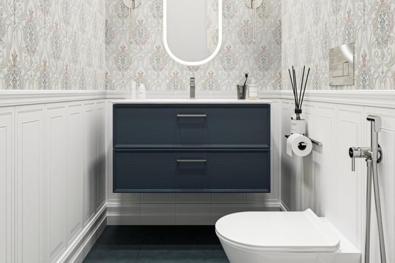 На стене расположена подвесная тумба в тон полу с накладной раковиной из серии PIANO / ПИАНО. Тонкая неоклассическая рамка на фасаде придаёт мебели особую элегантность и хорошо сочетается с уточнённой эстетикой раковины. Удобный подвесной унитаз PLAZA MODERN / ПЛАЗА МОДЕРН установлен на скрытую систему инсталляции.