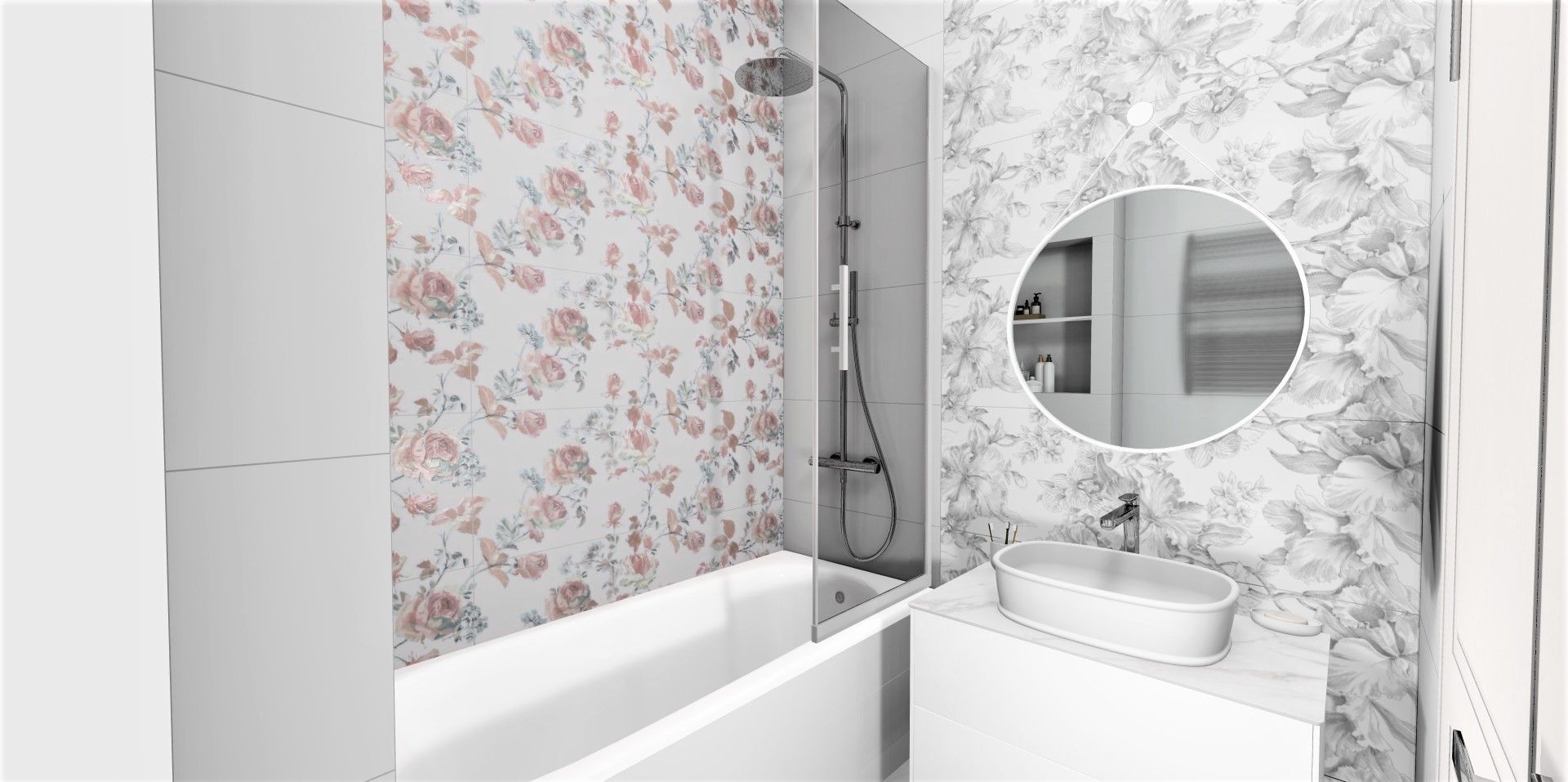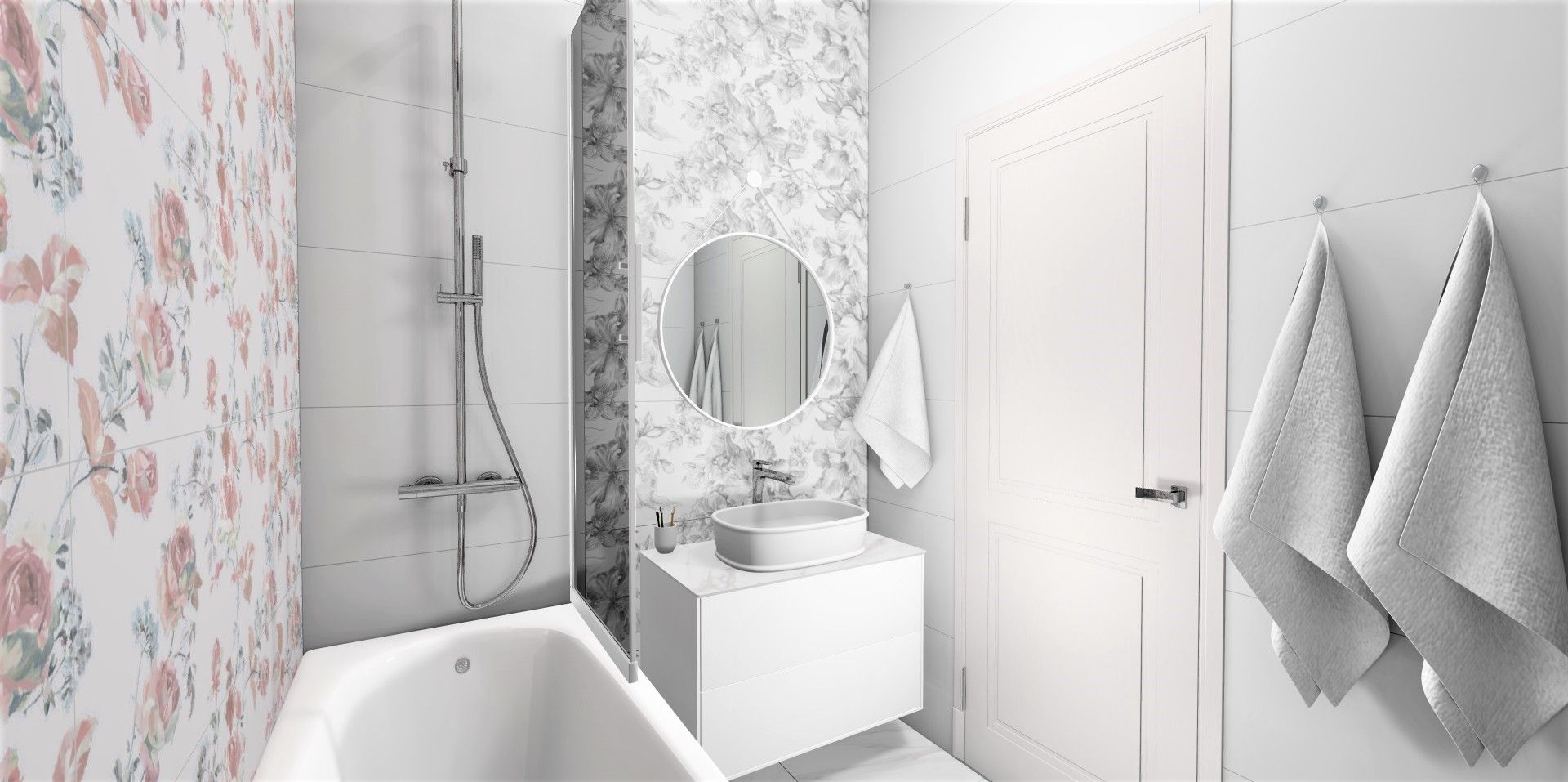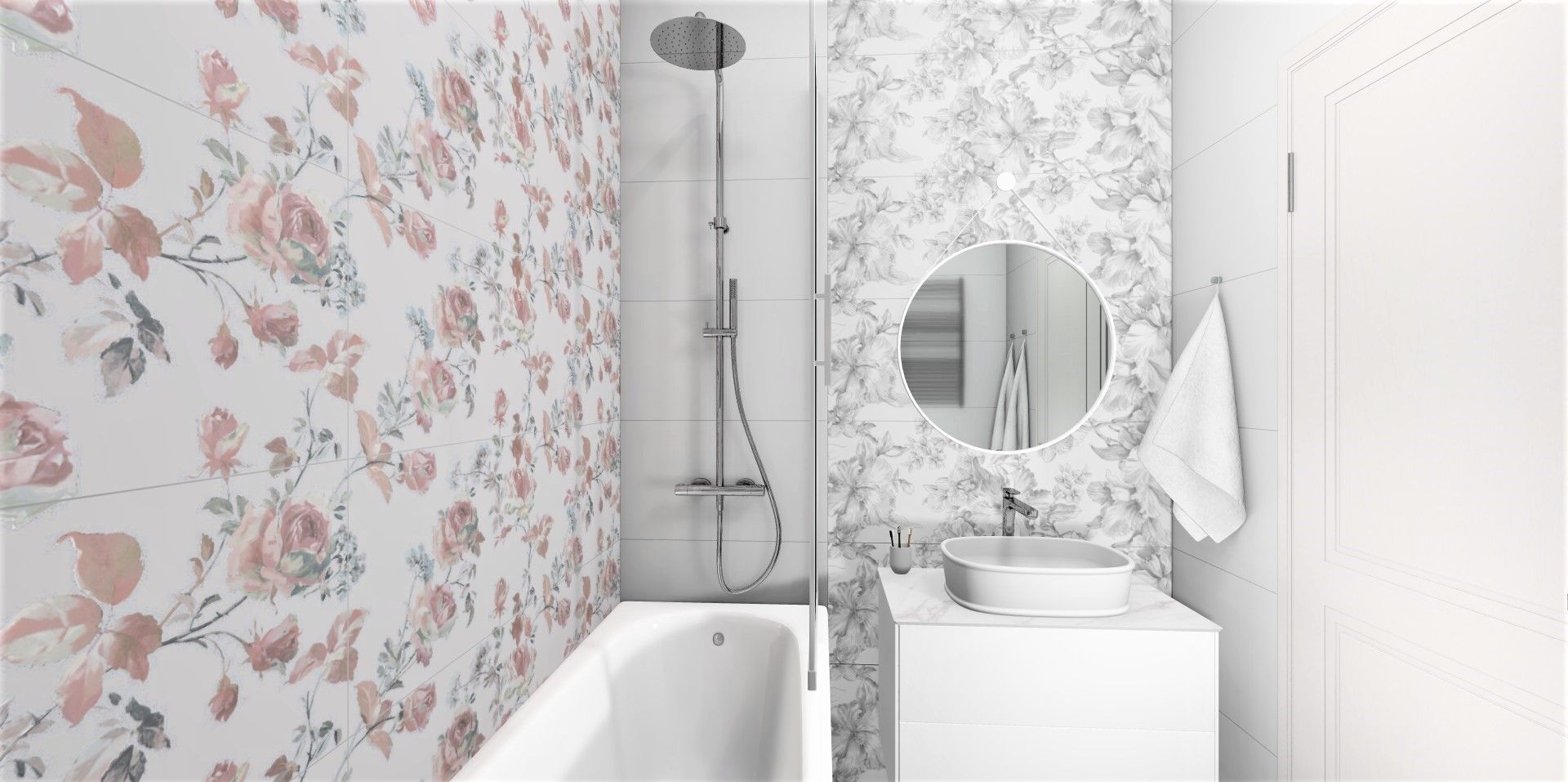 Две стены, ниша и зона с душевой конструкцией облицованы белой матовой плиткой Монфорте. Стена с зеркалом и раковиной выделена черно-белым декором Монфорте. Акцентная стена возле ванной облицована декором Монфорте Роза с нежными цветочными бутонами.
