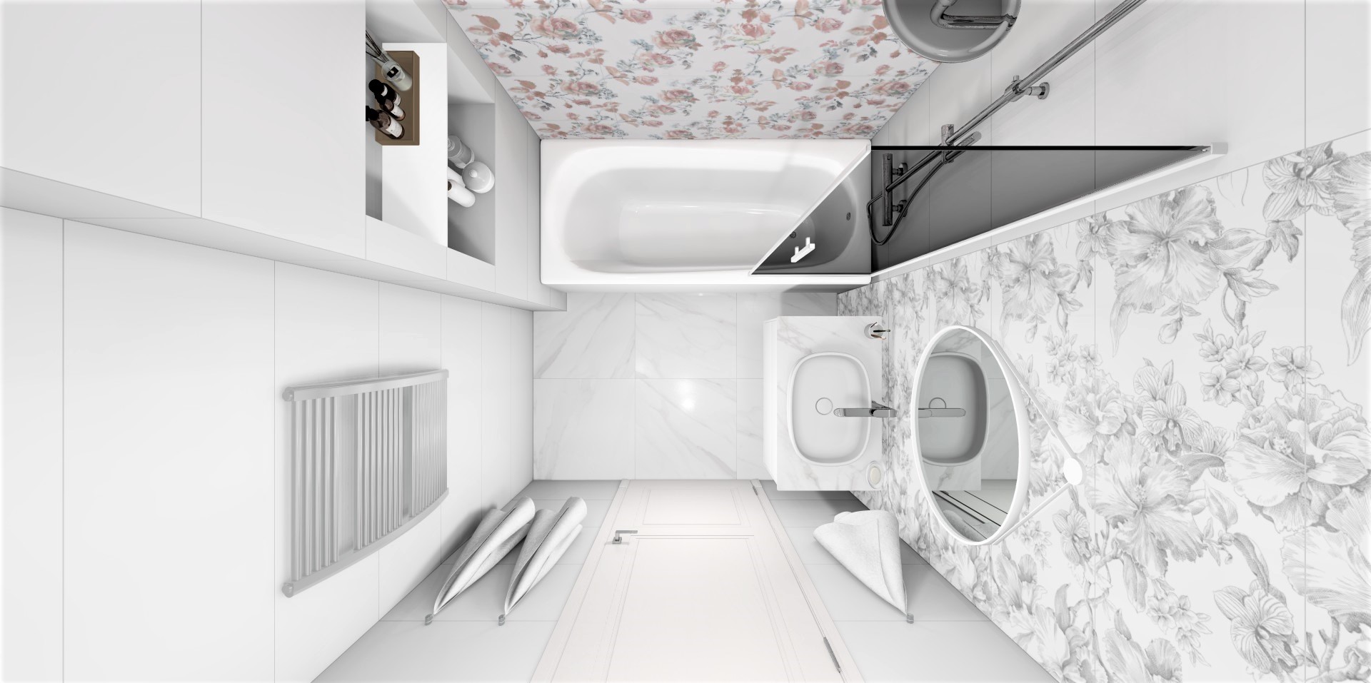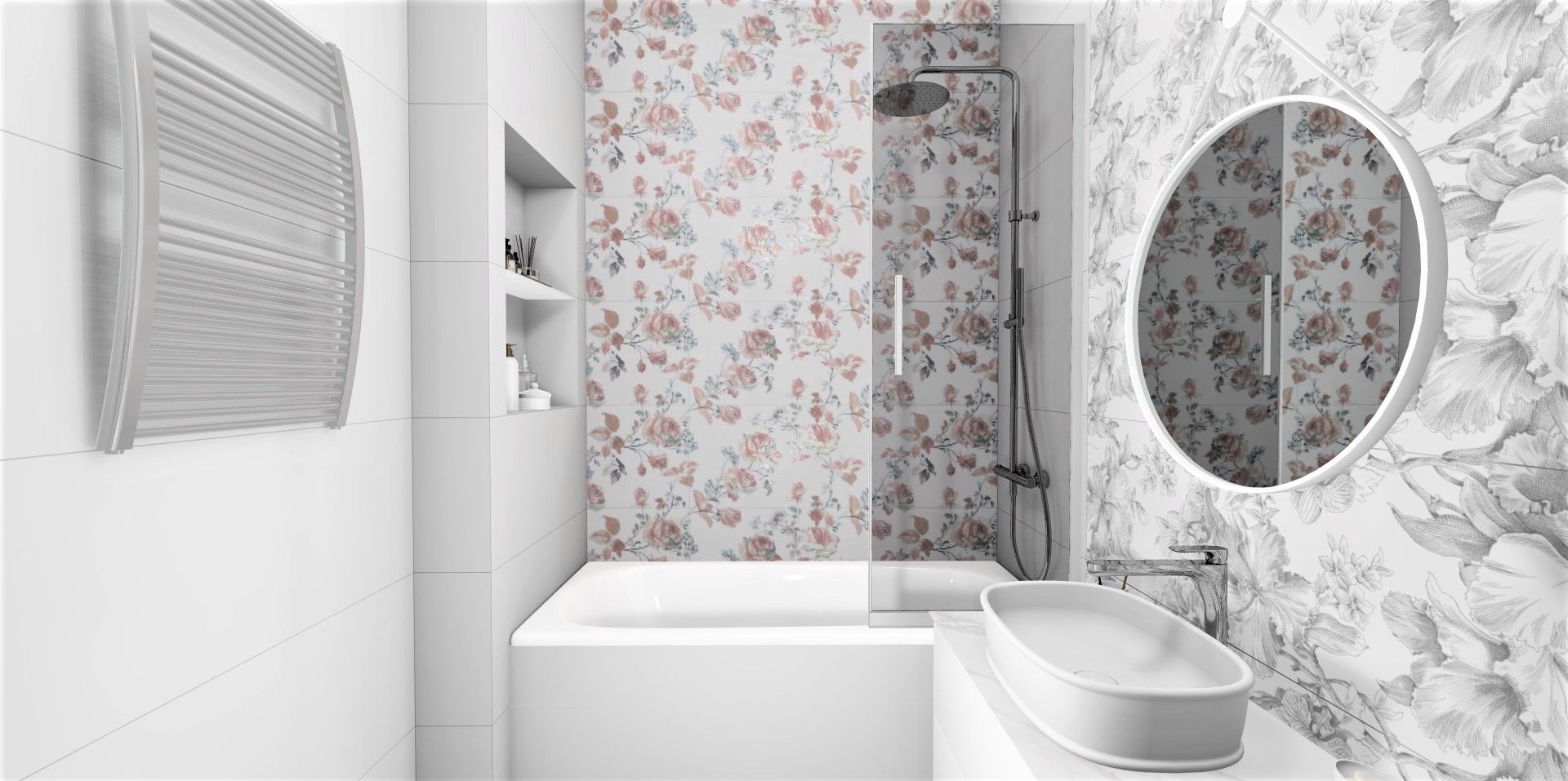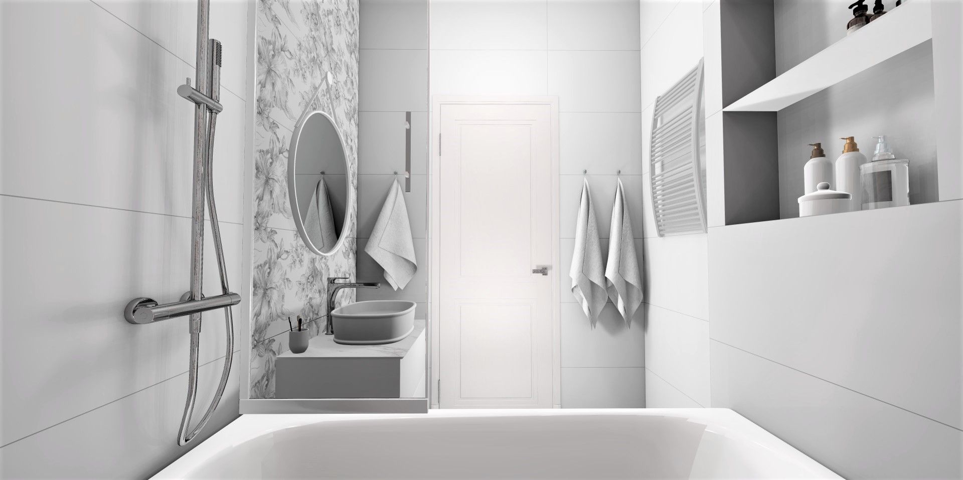 Две стены, ниша и зона с душевой конструкцией облицованы белой матовой плиткой Монфорте. Стена с зеркалом и раковиной выделена черно-белым декором Монфорте. Акцентная стена возле ванной облицована декором Монфорте Роза с нежными цветочными бутонами.
