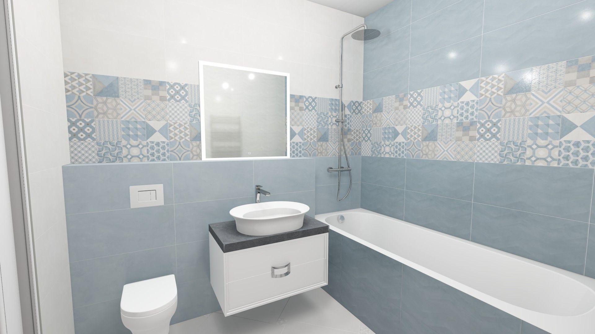 Это современный интерьер ванной комнаты в светлых тонах. Интерьер стильный, но при этом дает ощущение домашнего уюта. Декоры Онда в стиле пэчворк напоминают теплое лоскутное одеяло и создают уютную атмосферу.